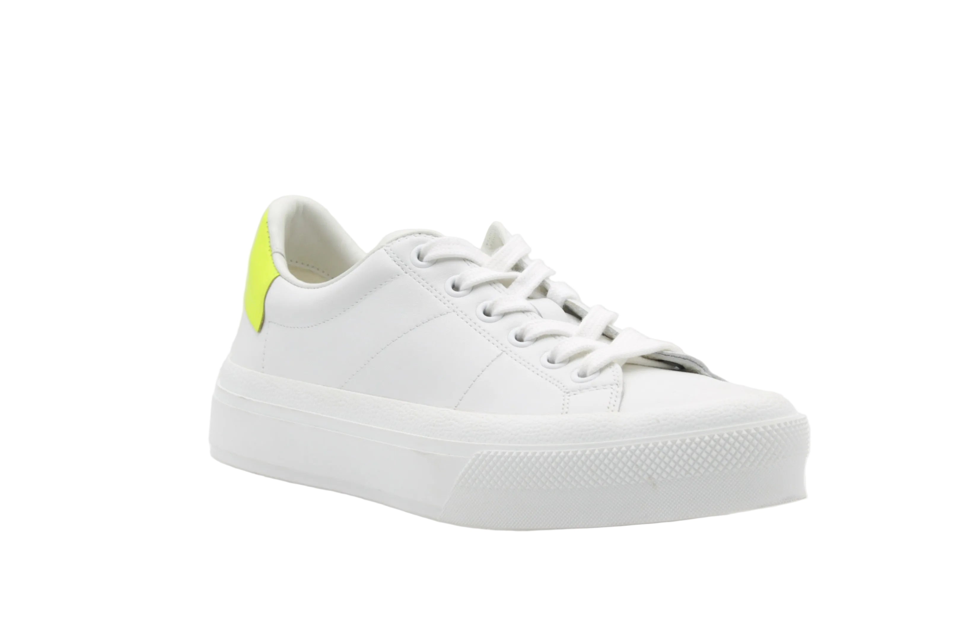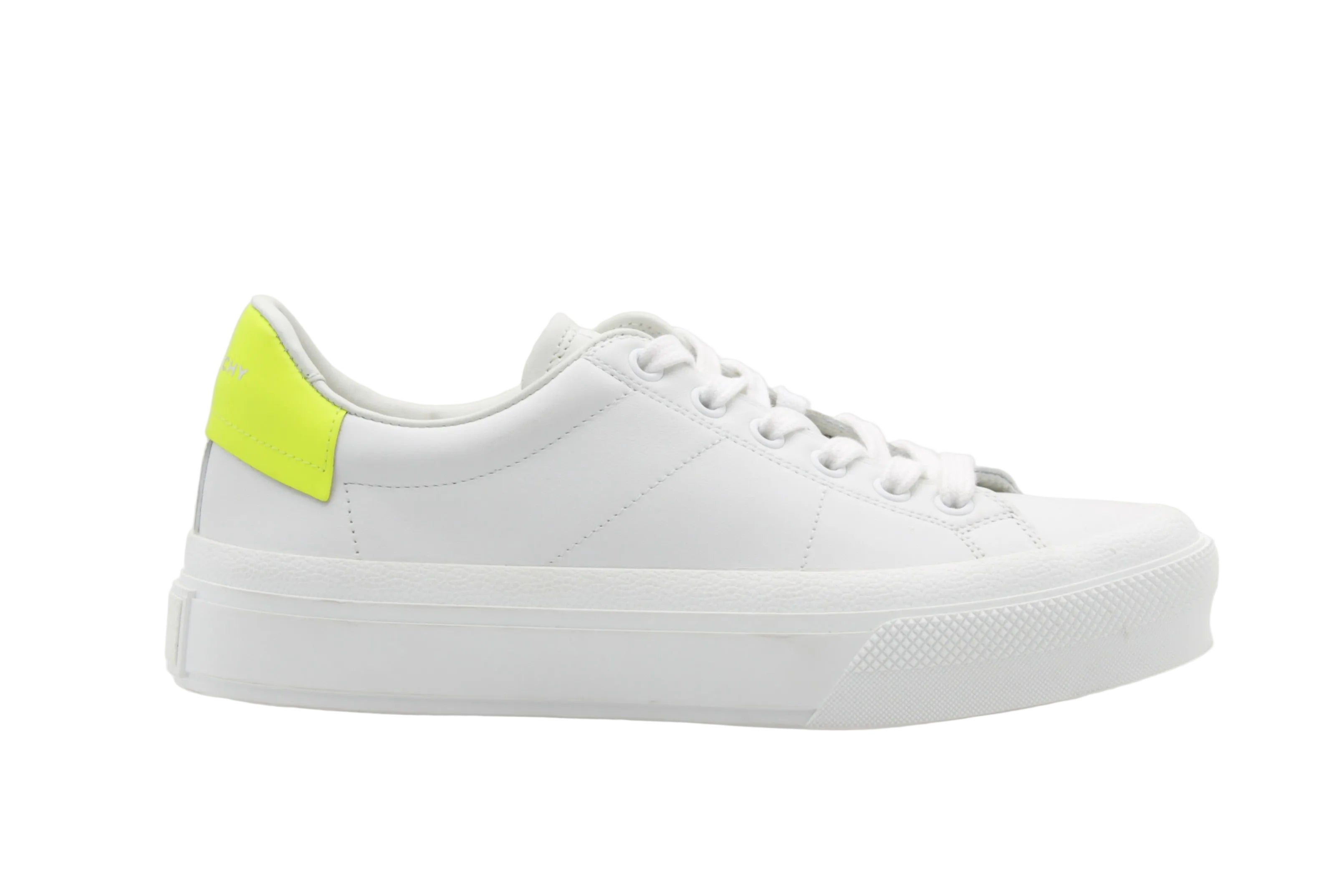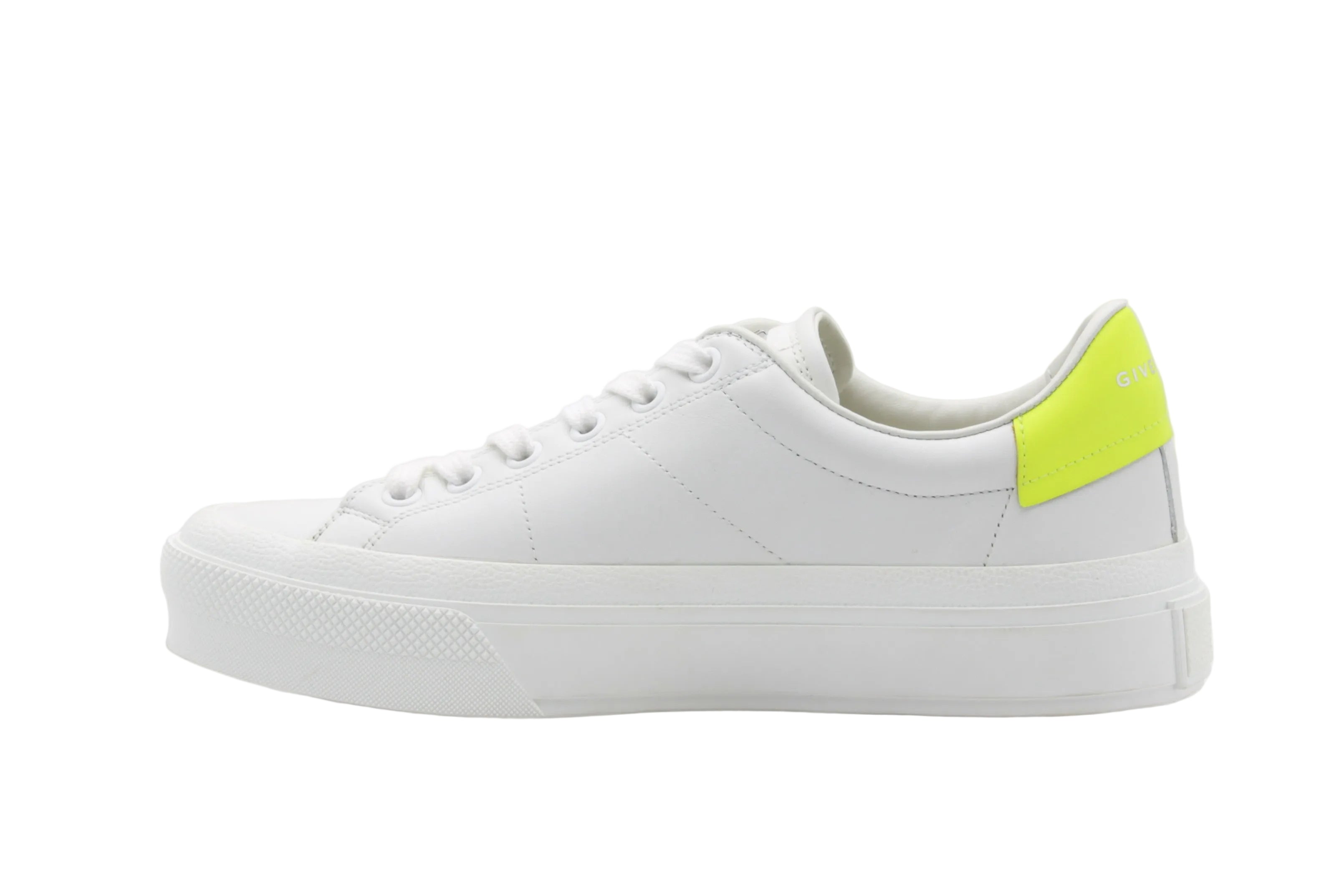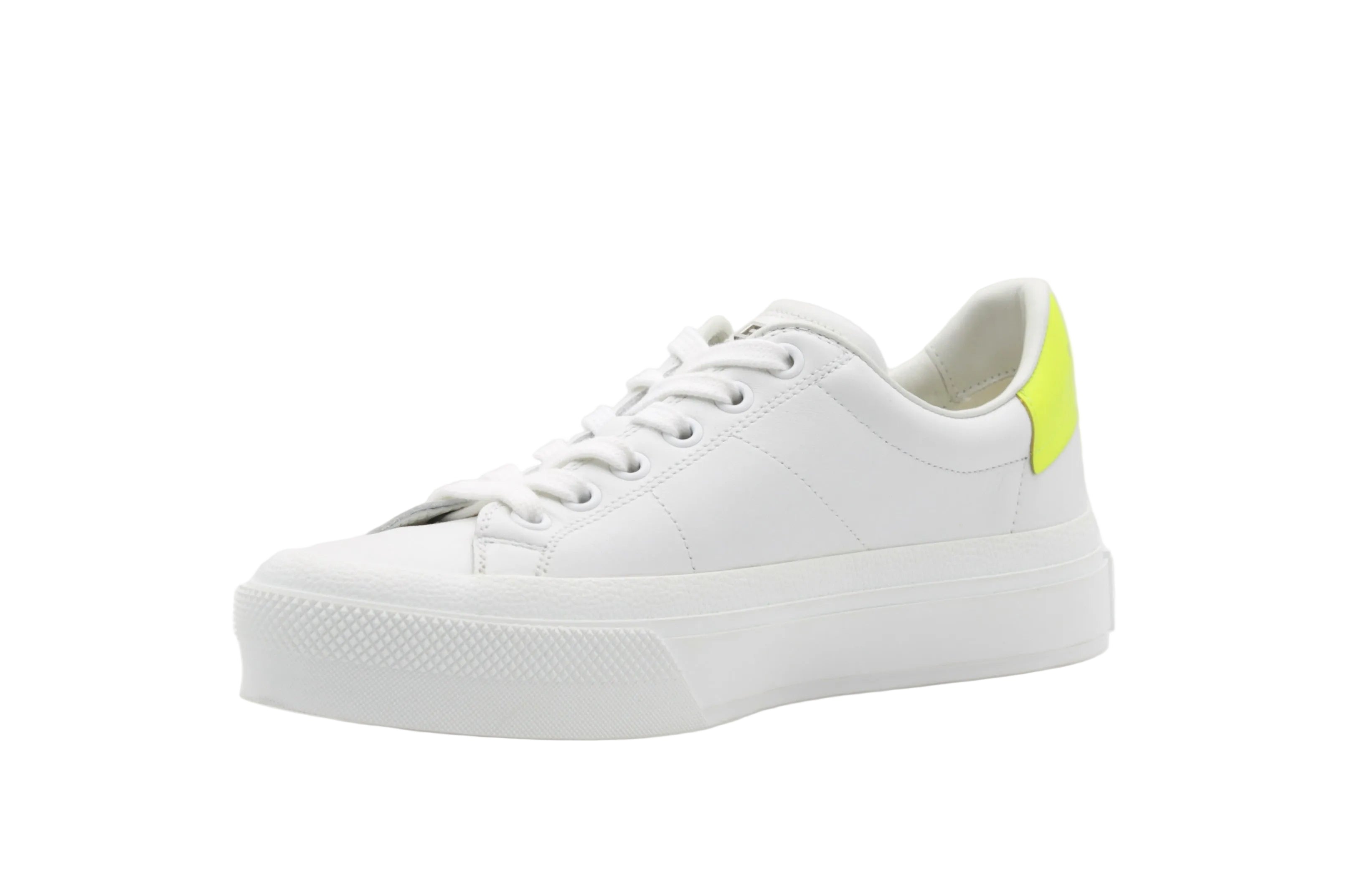 Les Givenchy City Sneaker blanc et jaune incarnent une esthétique minimaliste relevée par une touche contemporaine. Confectionnées en cuir blanc lisse, ces sneakers se distinguent par leur silhouette épurée et leur empiècement jaune contrastant au talon, signature discrète mais impactante.
