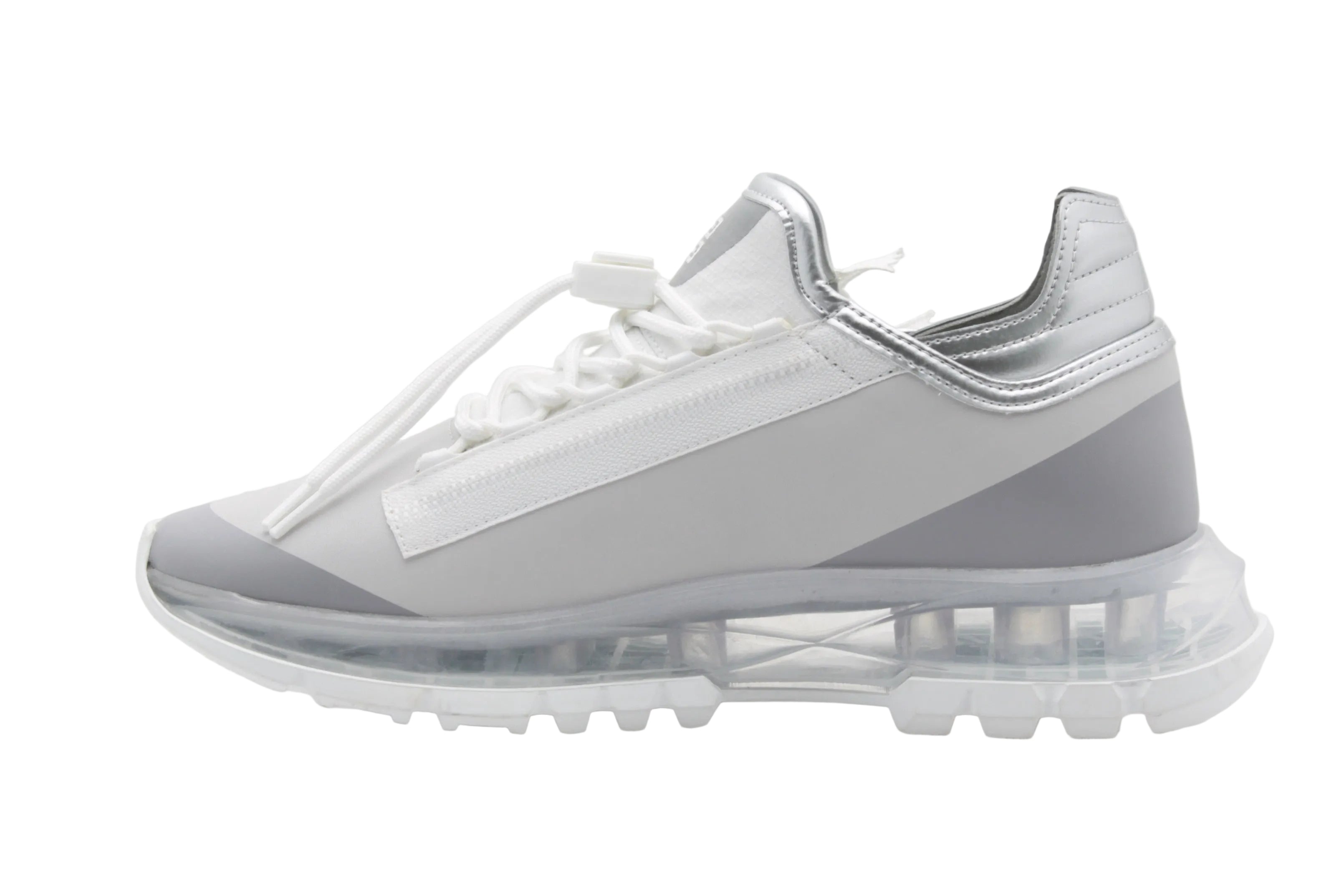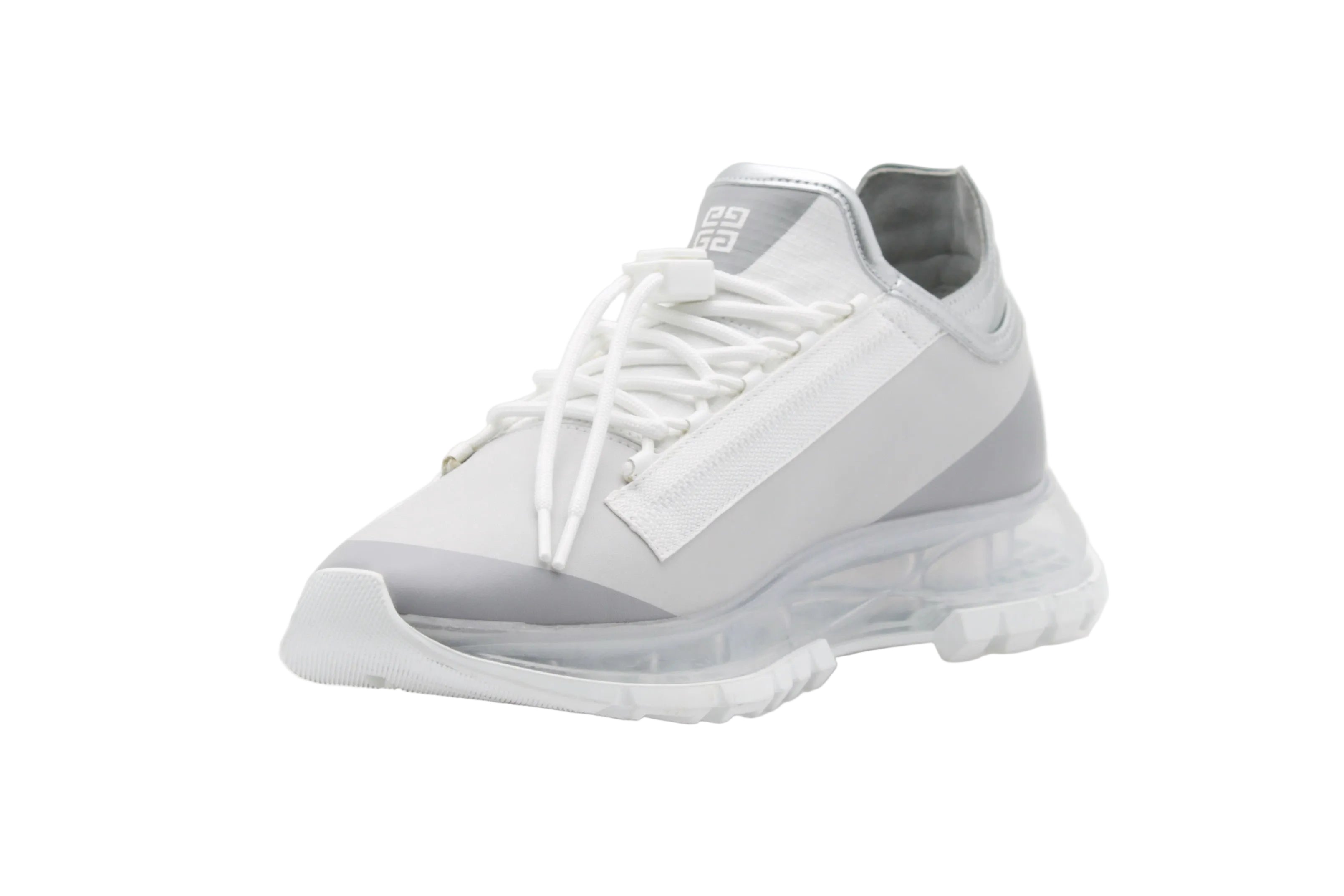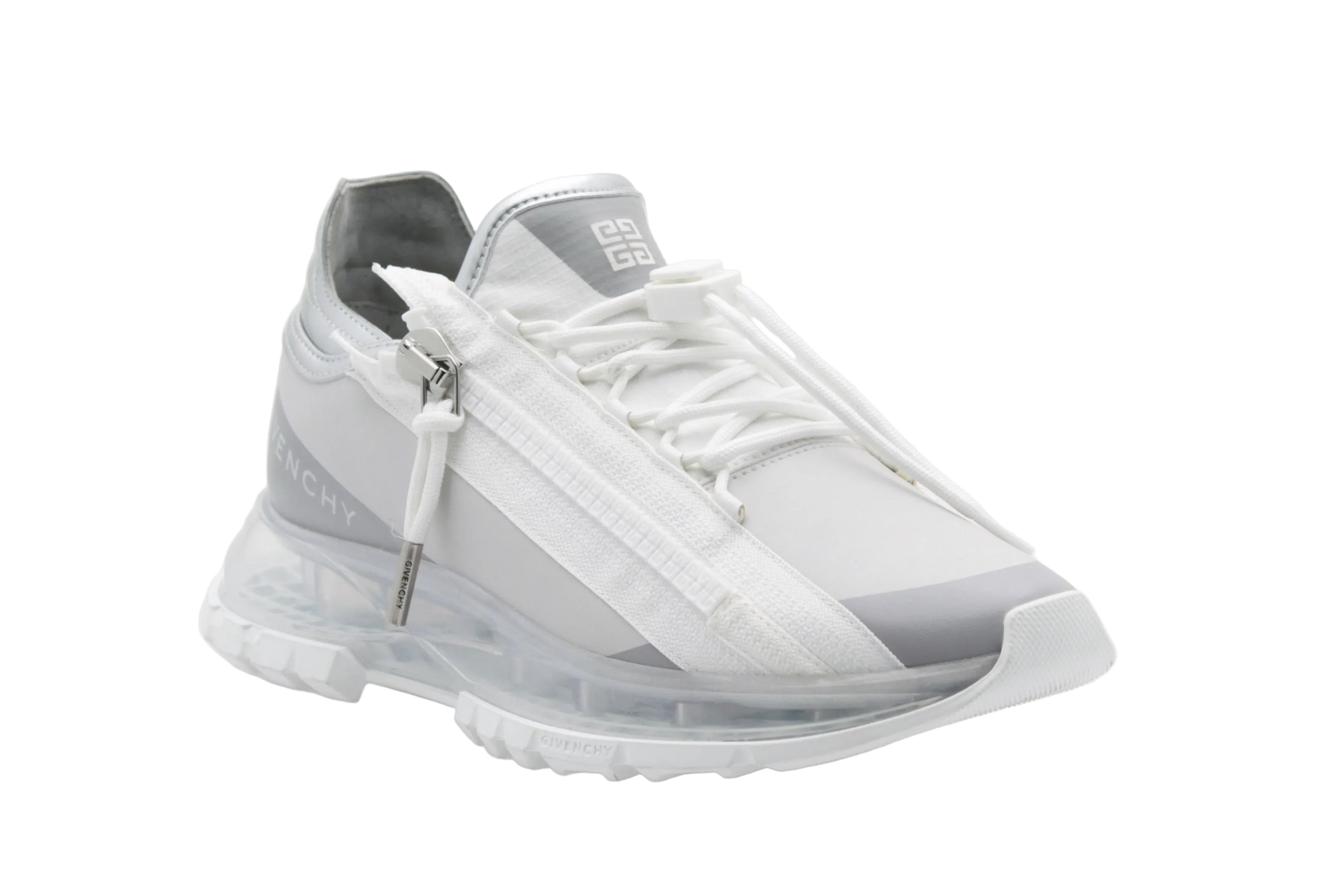 Les Givenchy Spectre Zip Runners blanc et argenté incarnent une esthétique moderne et technique, inspirée de l’univers running. Confectionnées en textile et matières techniques, ces sneakers se distinguent par leur design innovant avec zip latéral, leurs lignes dynamiques et leur semelle transparente sculptée, signature visuelle forte.